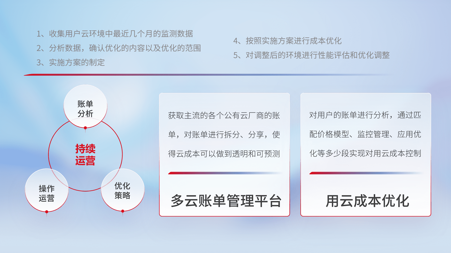通过多云纳管,,以统一的资源数据模型把客户的云资源进行抽象和封装,,,进而实现对多云资源的统一操作,,,保障云资源管理的可靠性、、、稳定性与可用性。。量身定制化运维内容,,配置、、、开发运维、、补丁管理、、备份、、、监控、、、认证和访问管理、、审计和日常巡检等,,,保障在用云过程中的可靠度,,,稳定度以及高可用率。。