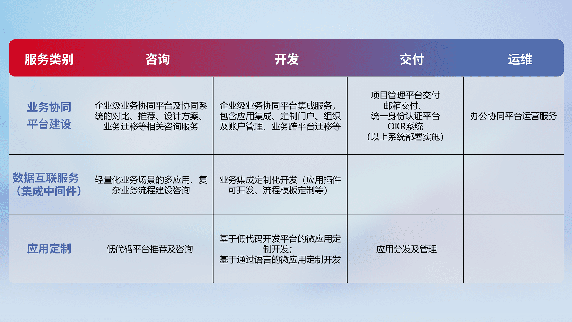 针对钉钉、、、企微、、、、IDaas等平台级产品提供产品的规划、、方案、、交付、、、定制化开发等服务,,实现如统一协同办公、、、、智能客户服务、、、、混合会议管理、、、智能数据查询、、、、等业务场景,,,实现数字化转型。。。